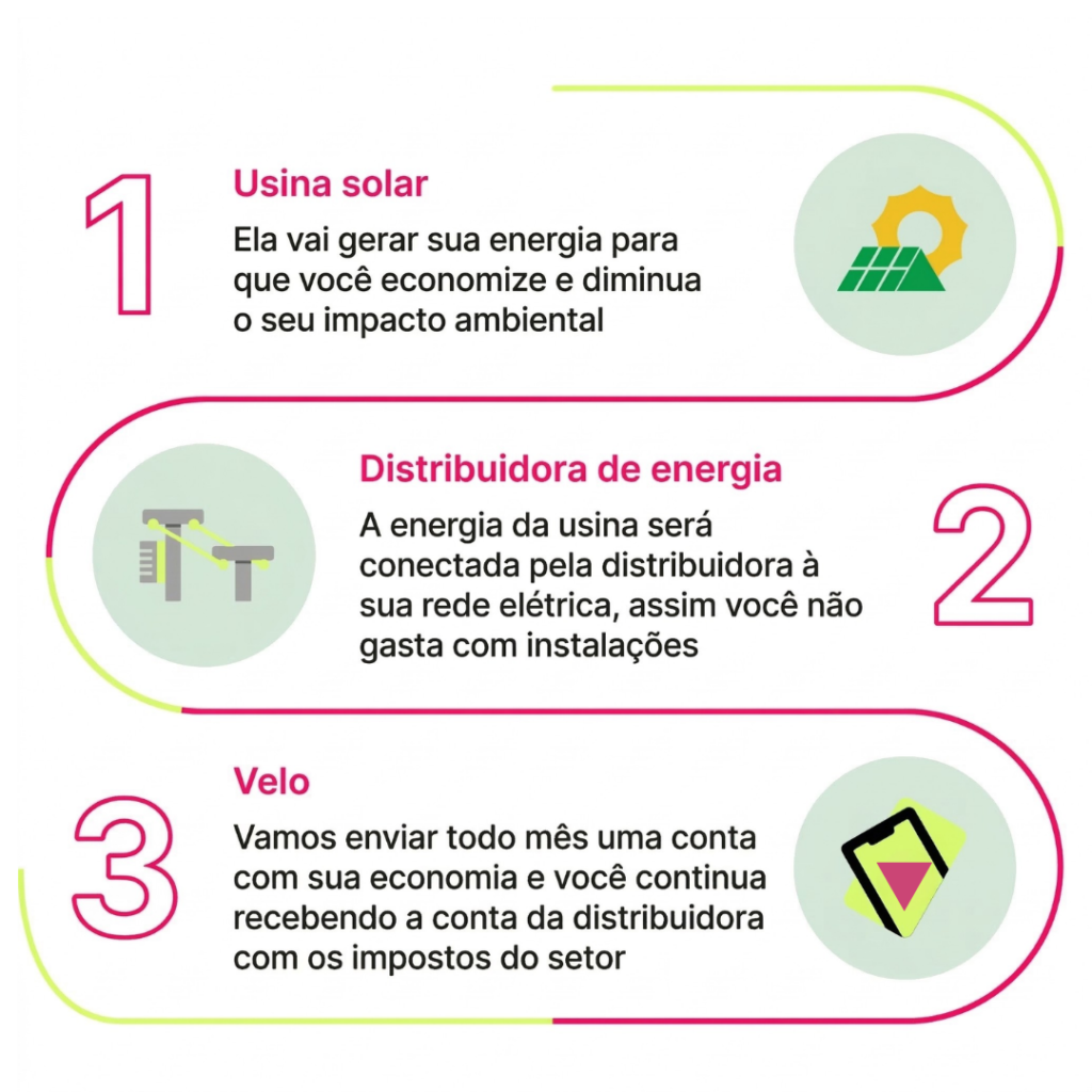 Você já começa a economizar a partir da sua primeira fatura VELO! Após a assinatura do contrato, você receberá os créditos de energia em até 90 dias.